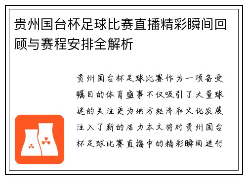 贵州国台杯足球比赛直播精彩瞬间回顾与赛程安排全解析