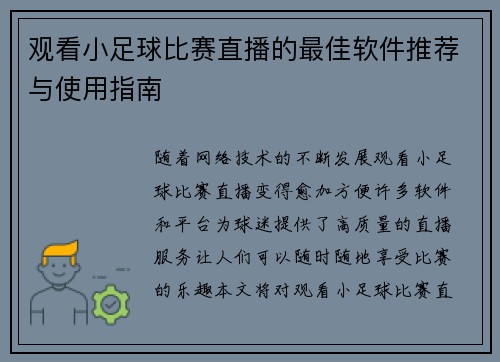 观看小足球比赛直播的最佳软件推荐与使用指南